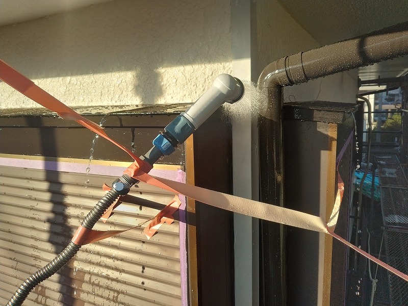 本日は、昨日再施工を行った雨漏り箇所の散水検査を行いました。