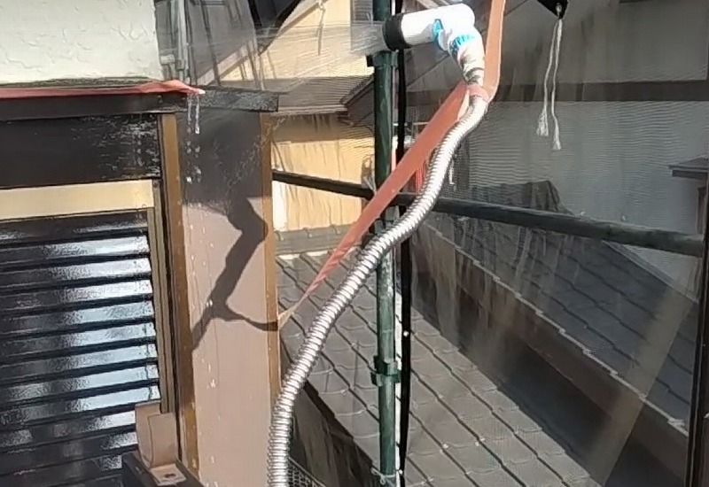 外壁のひび割れのUカットを行った箇所へ模様吹き付けです。既存と模様をなるべく合わせるために、初めに、細かい模様を吹き付けた後に、大きい模様を吹き付けました。