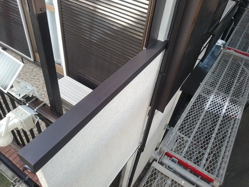 バルコニー腰壁と絡んでいる戸袋側板への新規板金張りです。