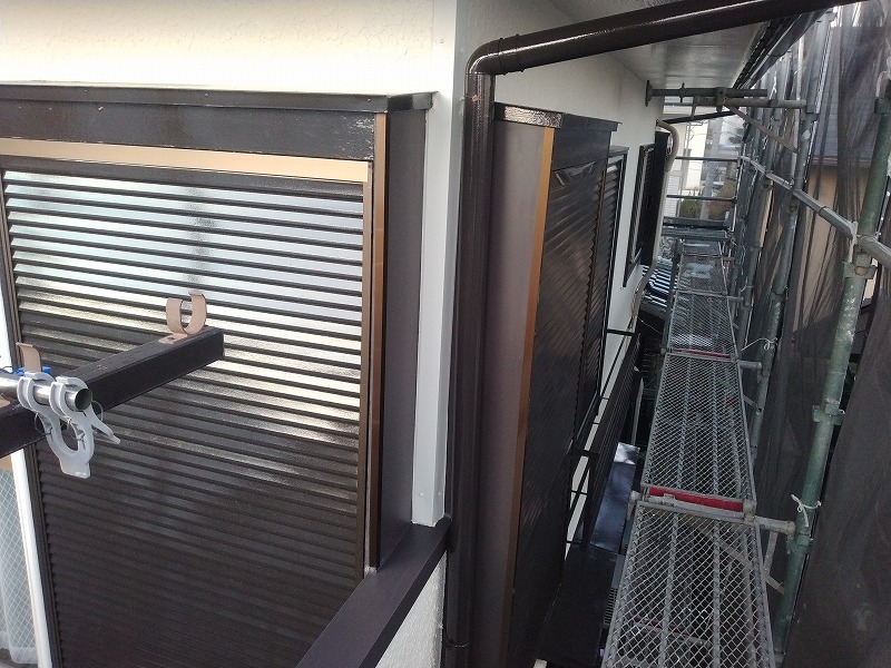 本日は、雨戸戸袋のサビ止め塗装や上塗り1回目、各付帯部の上塗り1回目などを行いました。