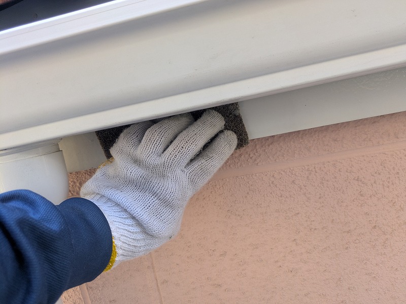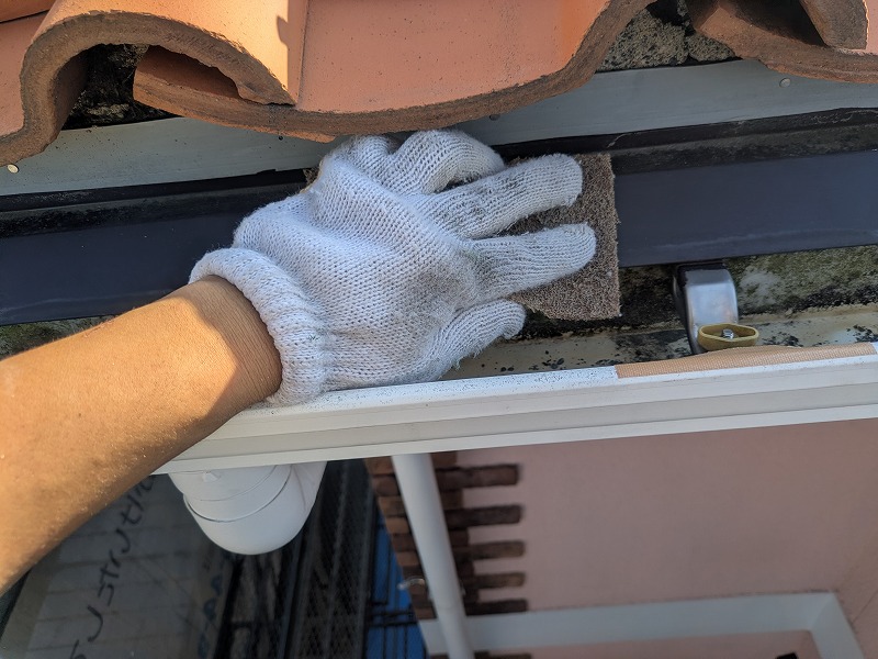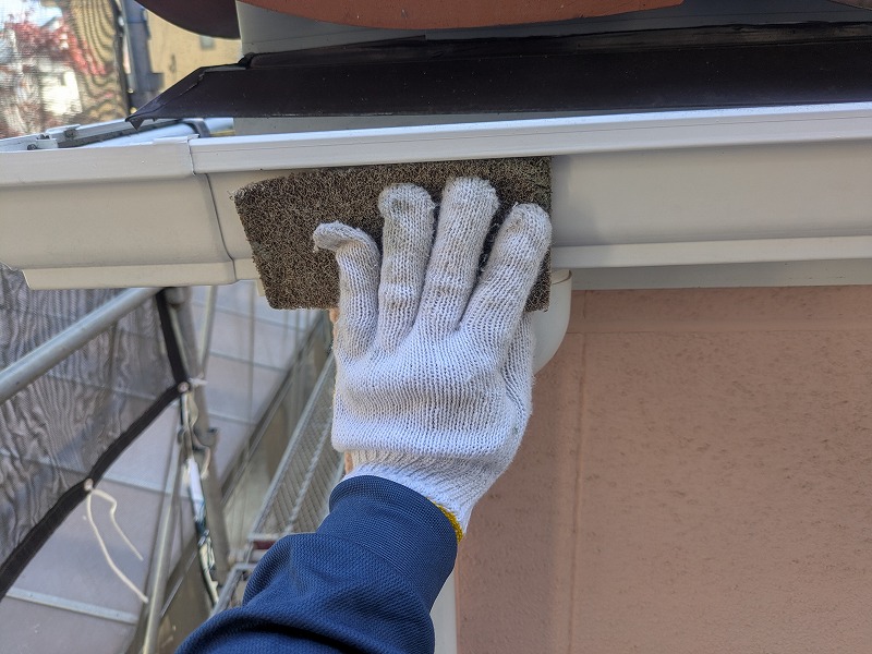 軒樋の中を洗っています。