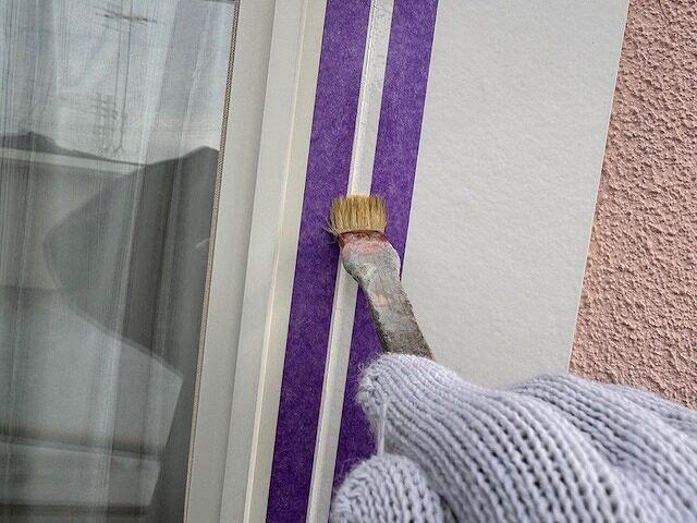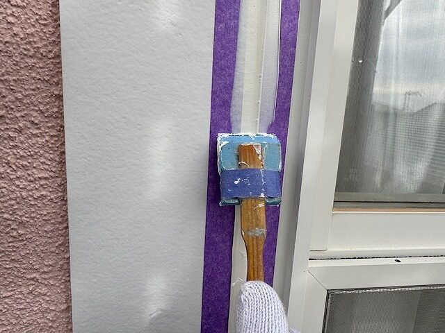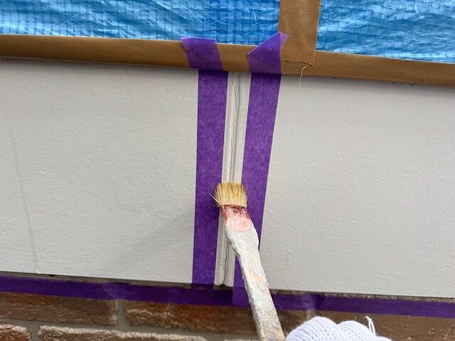 サイディングの目地にプライマーを塗布しています。