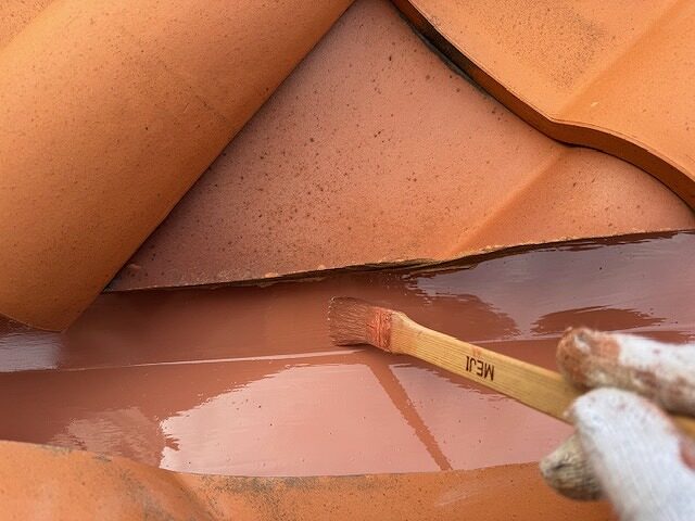装飾タイル上部にプライマー塗布後、シーリング材を充填しています。