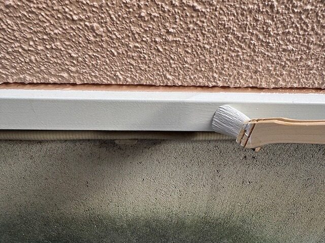 エアコン配管カバーの取り付け後に上部のシーリング処理を行っています。