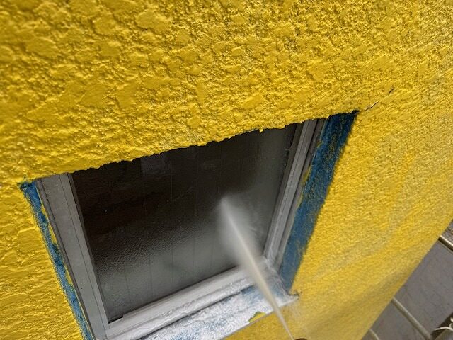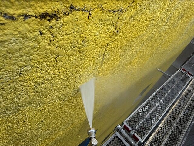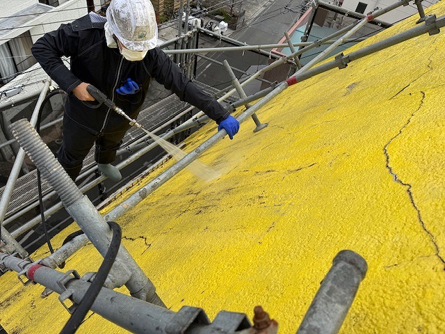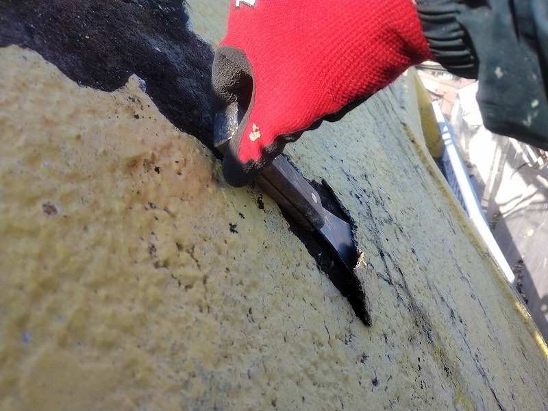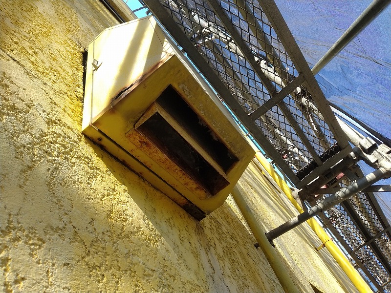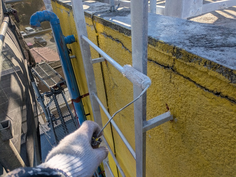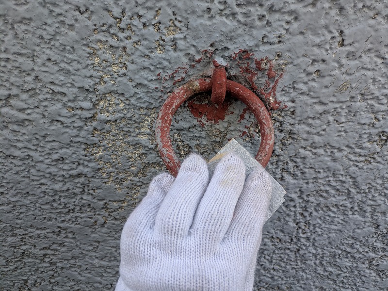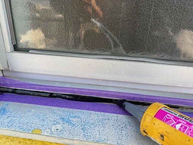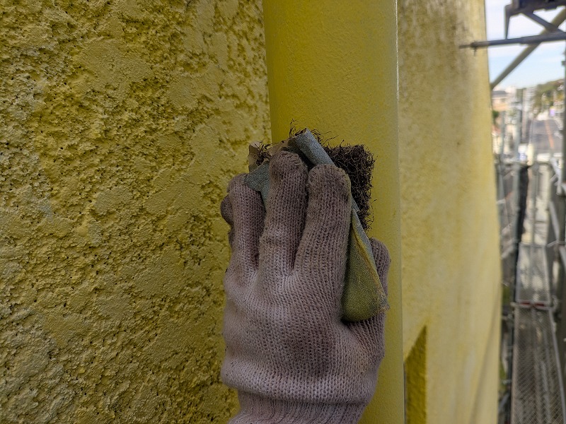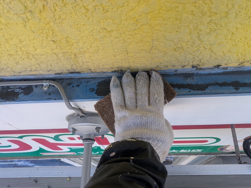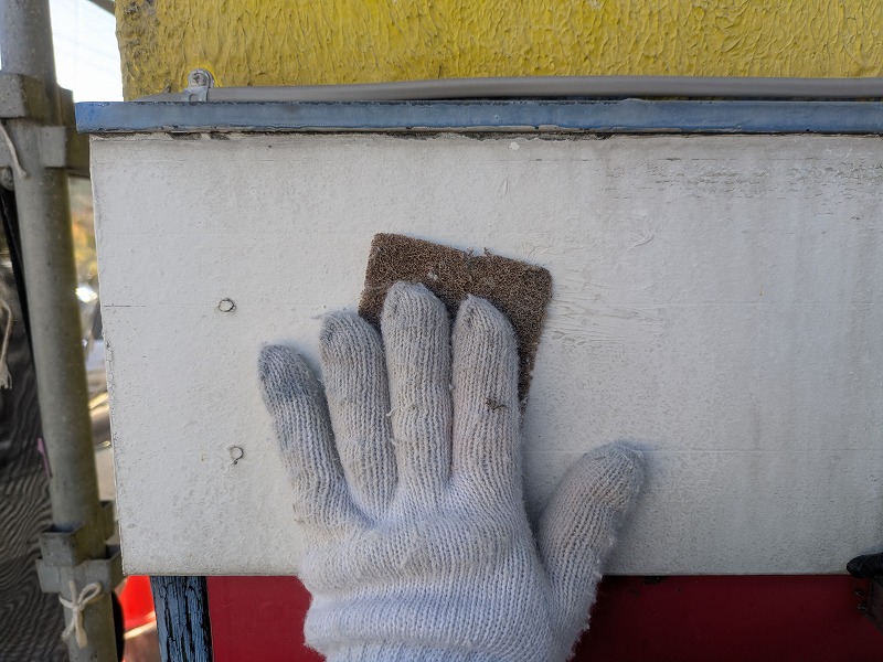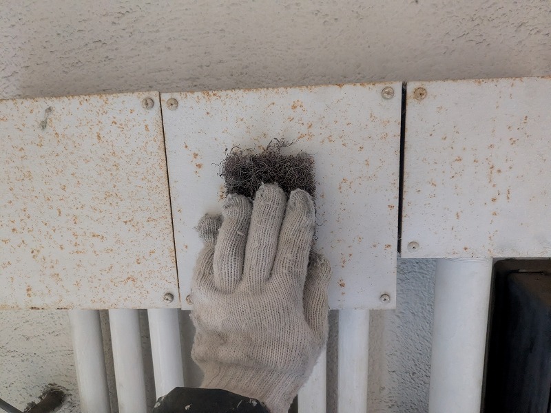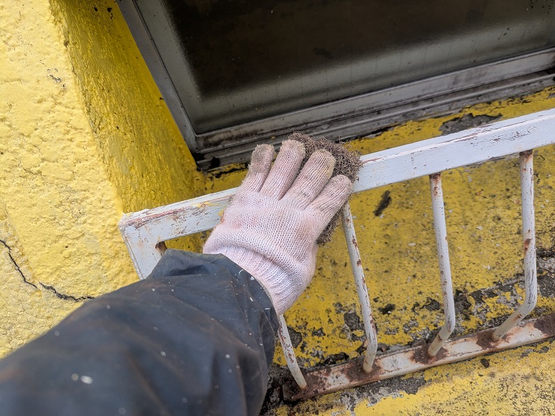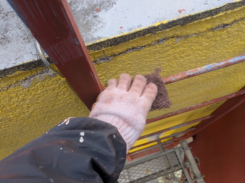 本日はケレンの続きやさび止め塗装、既存シーリングの撤去などを行いました。
