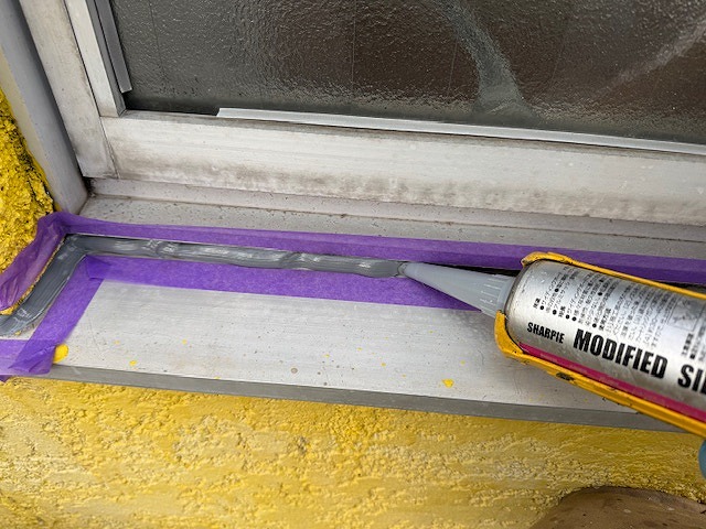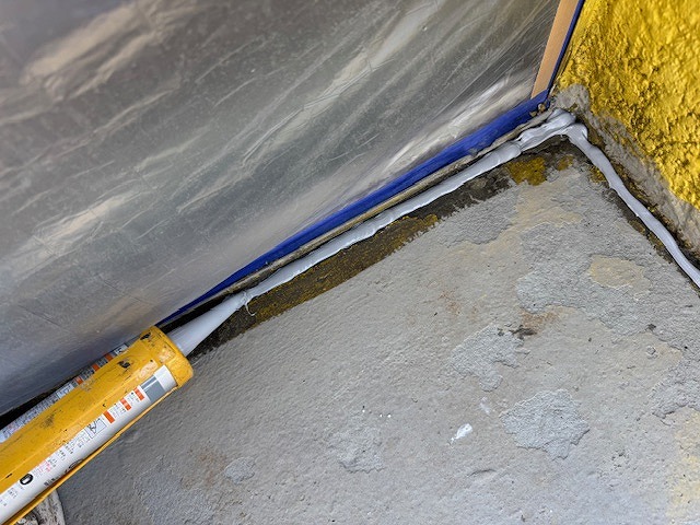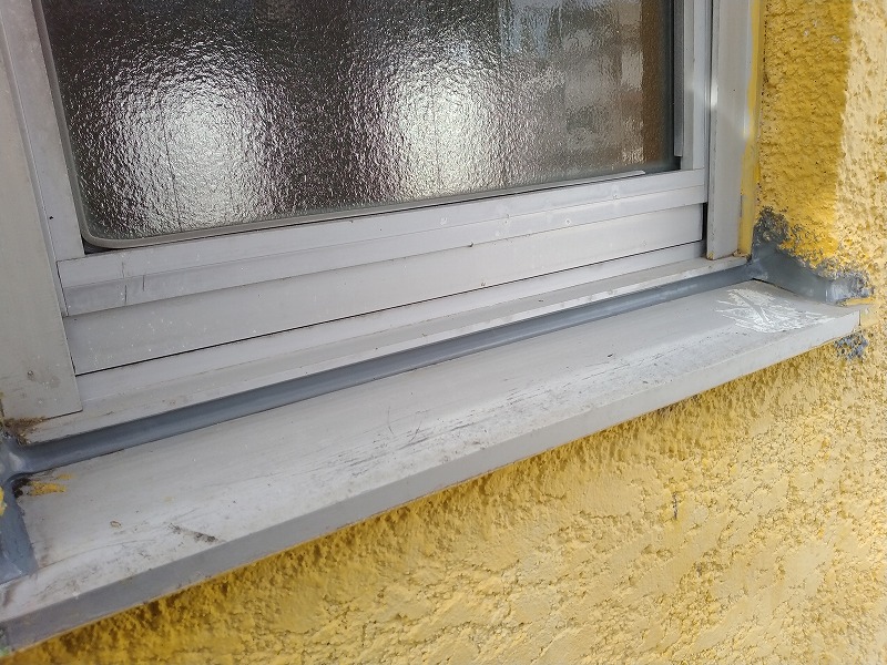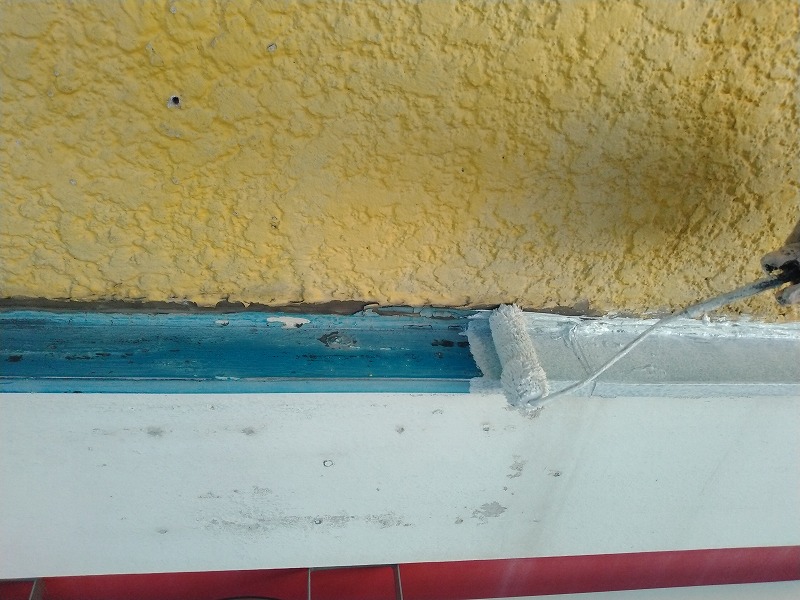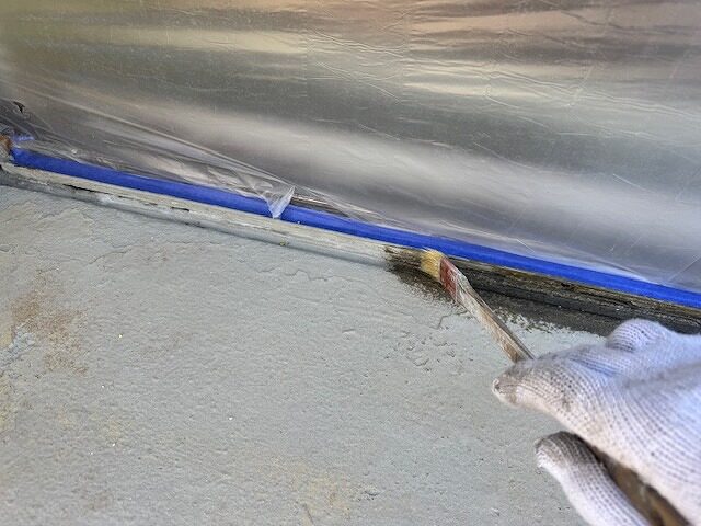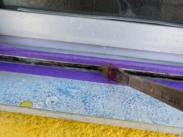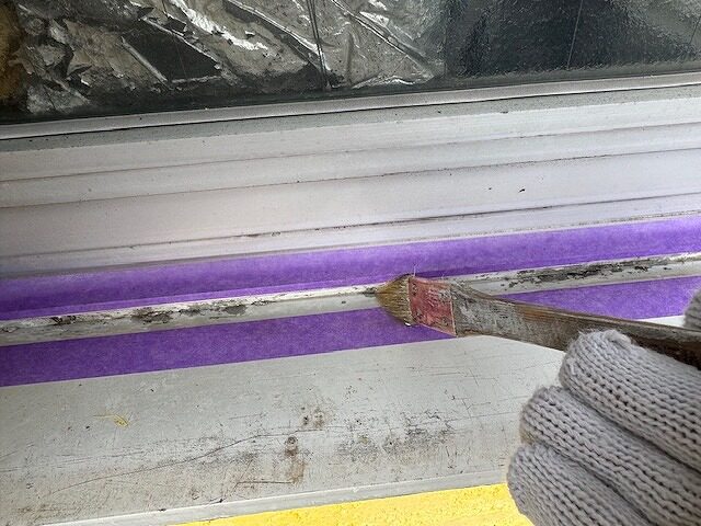 写真は皿板とサッシの間にプライマーを塗布しているところです。
