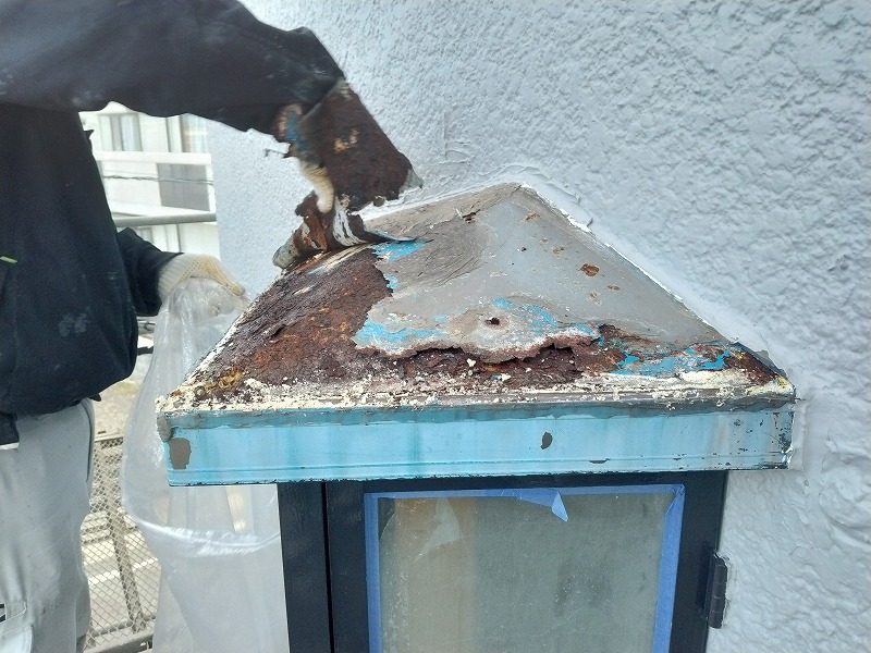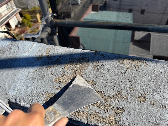 笠木の脆弱塗膜を除去しています。
