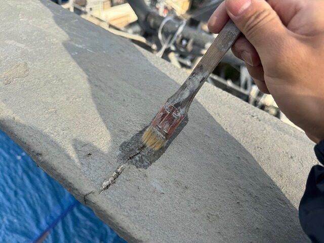 写真は笠木のひび割れ補修を行っているところです。