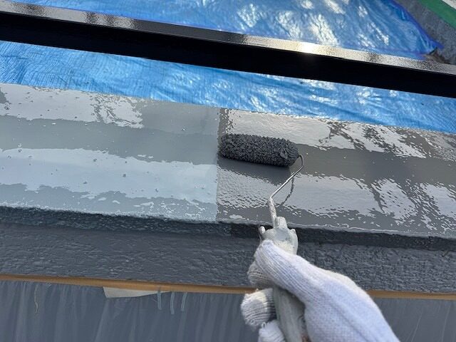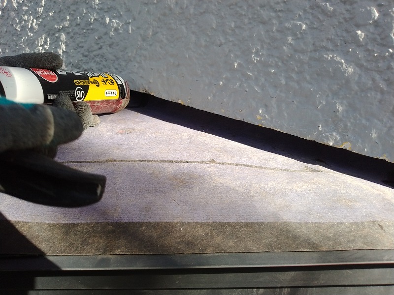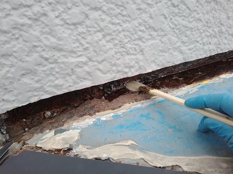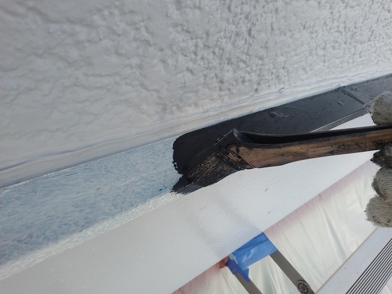 写真は三角出窓の屋根板金の外壁との取り合いにプライマーを塗布しているところです。