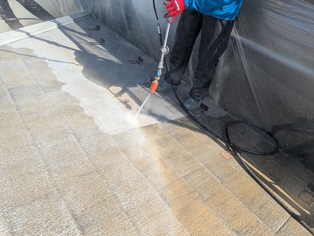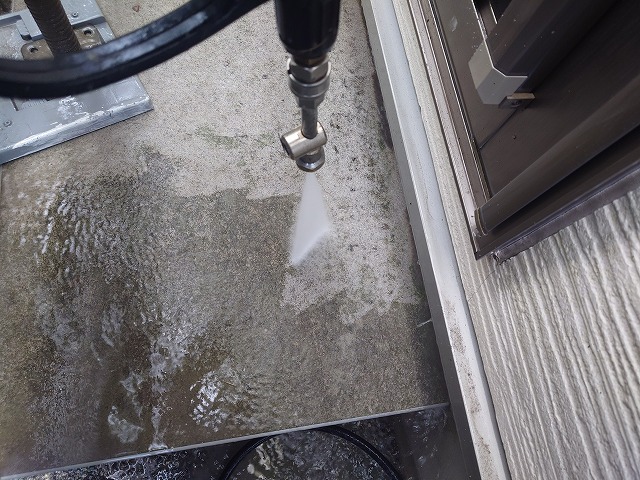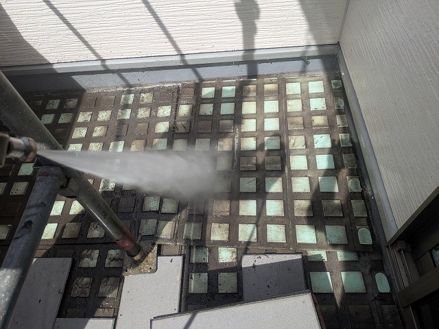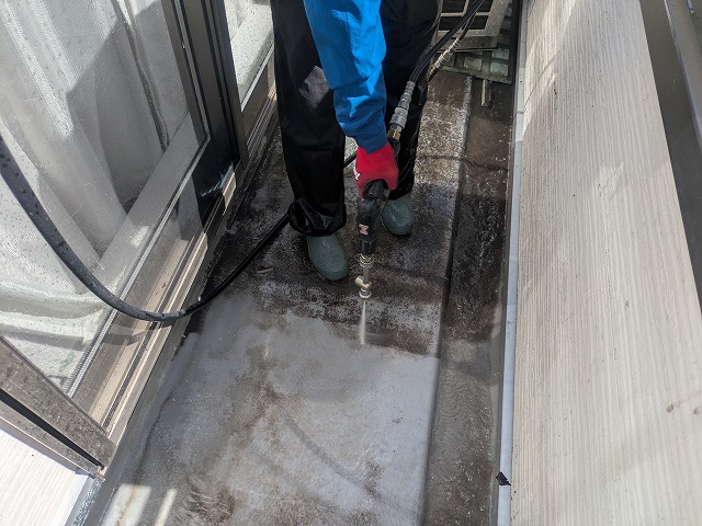 バルコニー床のタイル及びクッション材撤去後の、FRP防水の高圧洗浄です。
