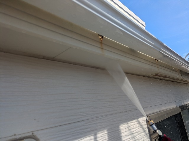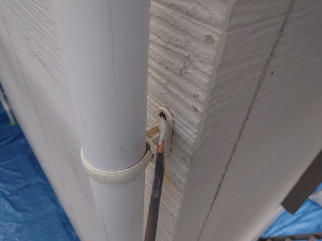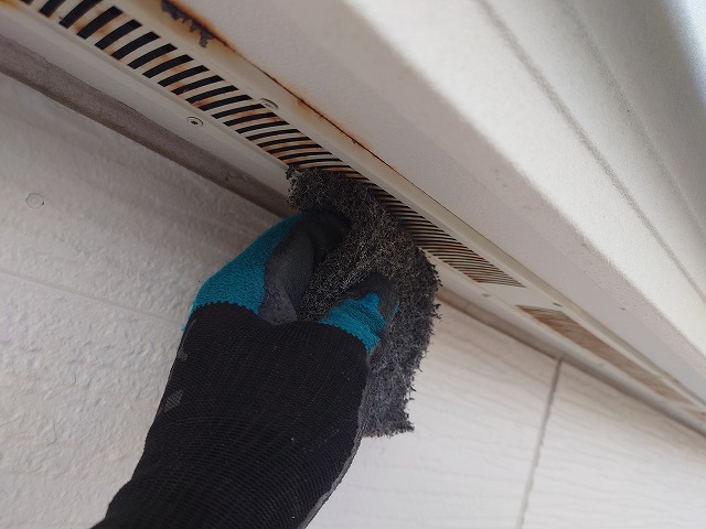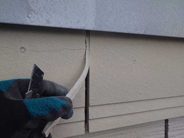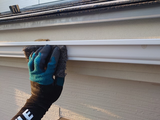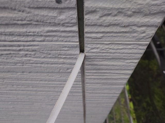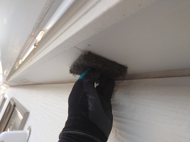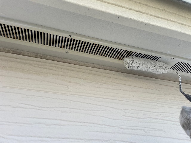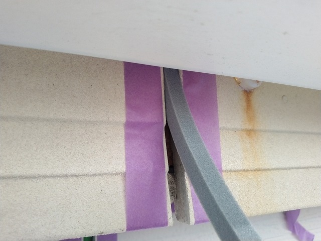 写真は、破風板及び鼻隠しの目地へバックアップ材の挿入です。