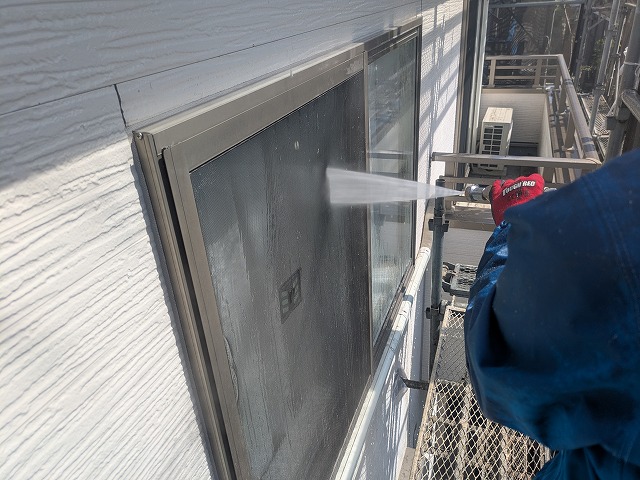 本日は、外壁目地の既存シーリング撤去や新規シーリング打ち均し用の養生などを行いました。