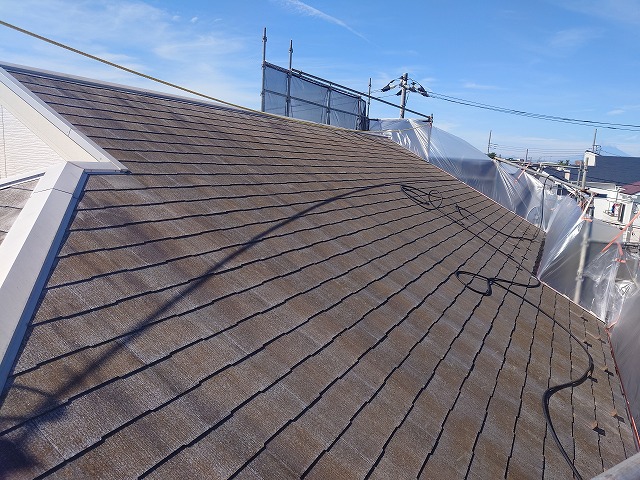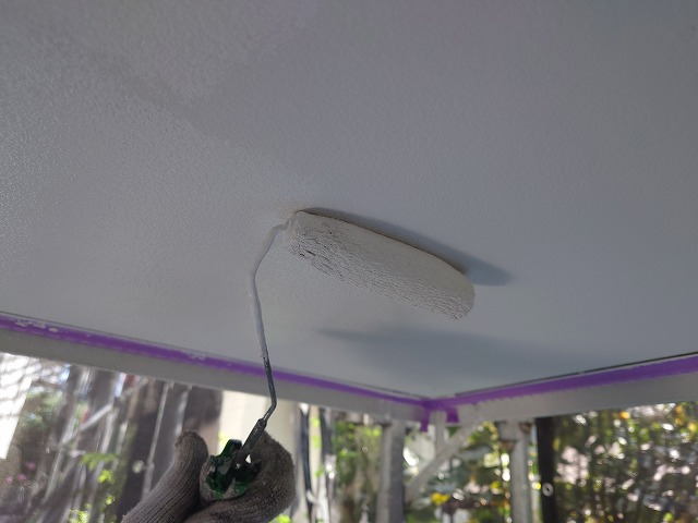 本日は、屋根の上塗り1回目や塗料の飛散防止用のビニル養生などを行いました。