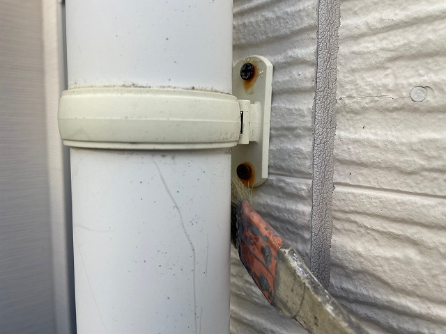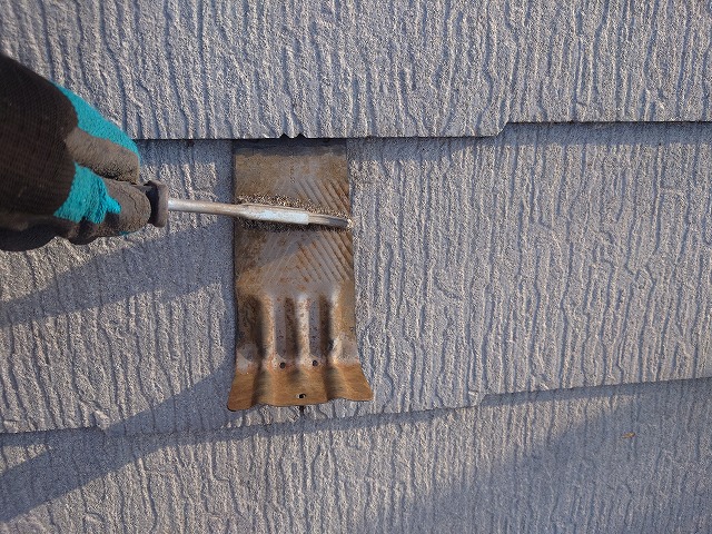 雨樋の支持金物のビス部分のサビ素面調整補助材の塗布です。