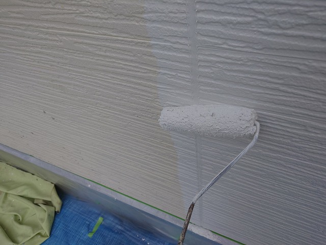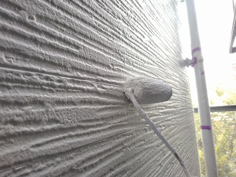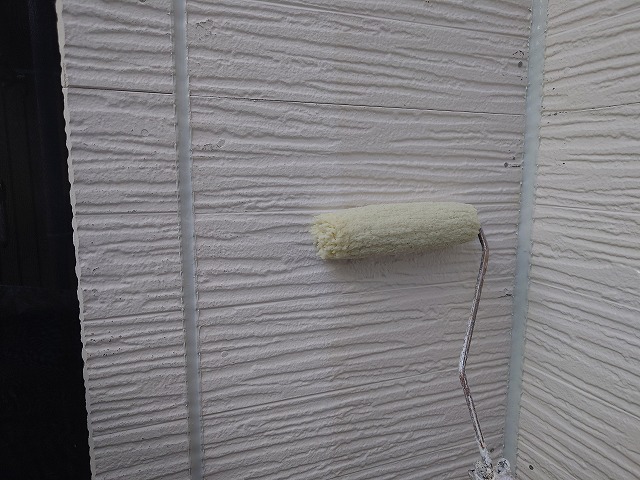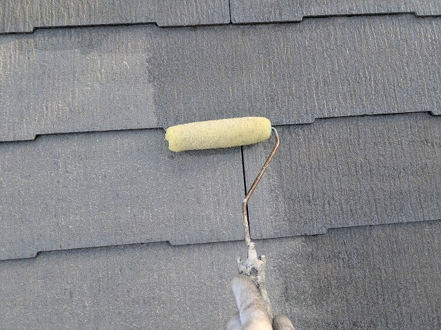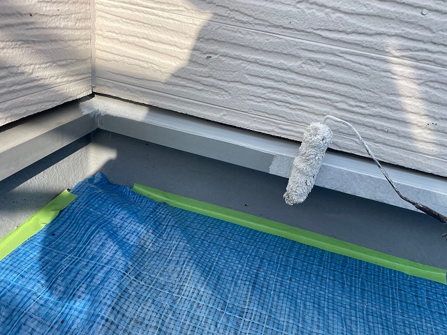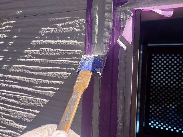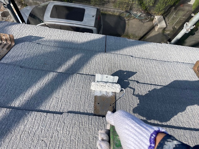 本日は、外壁目地の新規シーリング打ち均し用の養生や屋根の下塗りなどを行いました。