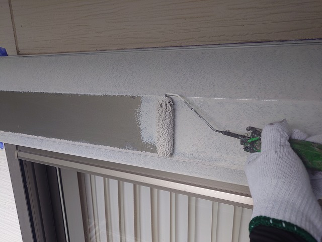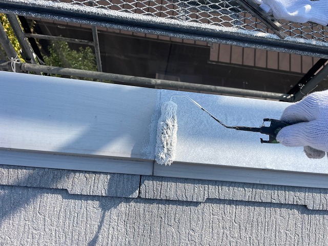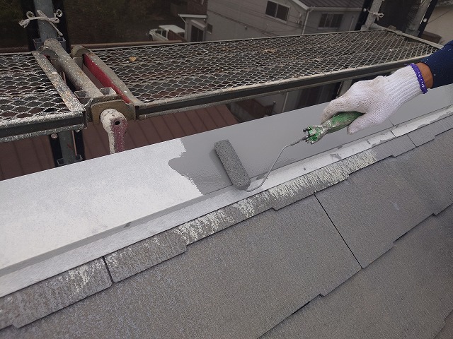 写真は、棟包みと呼ばれる屋根板金の上塗り1回目です。