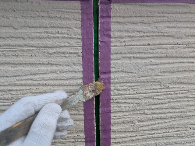 写真は、外壁目地のシーリング用プライマー(下塗り材)塗布です。