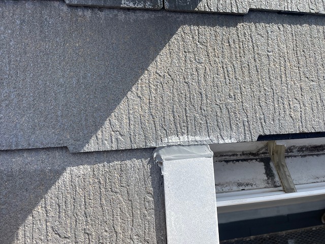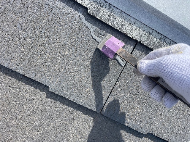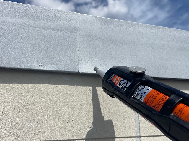 屋根のスガリ部分のケラバ板金の新規シーリング打ち均しです。