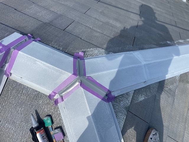 屋根板金の継ぎ目へ新規シーリング打ち均しです。