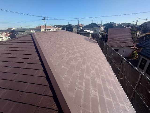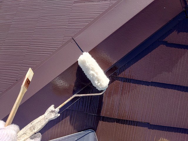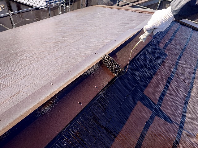 写真は、棟包みと呼ばれる屋根板金のクリヤートップコート塗布です。