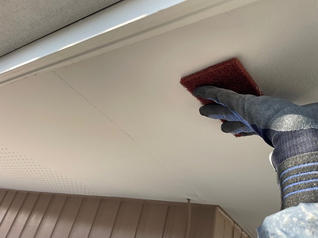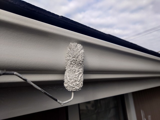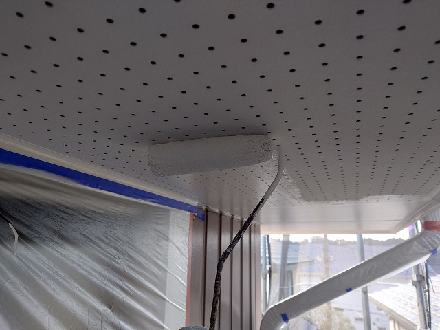 本日は、屋根のクリヤートップコート塗布や塗料の飛散防止用のビニル養生、軒裏の上塗り1回目などを行いました。