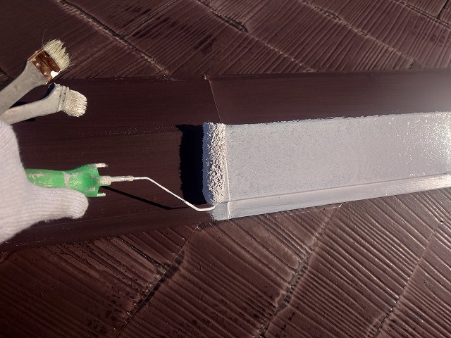 写真は、棟包みと呼ばれる屋根板金の上塗り1回目です。