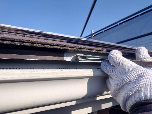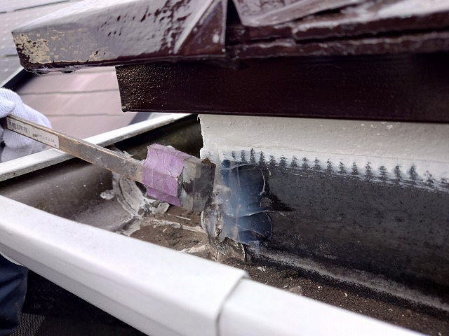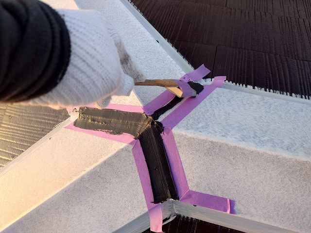 屋根板金の継ぎ目部分のシーリング打ち均しです。