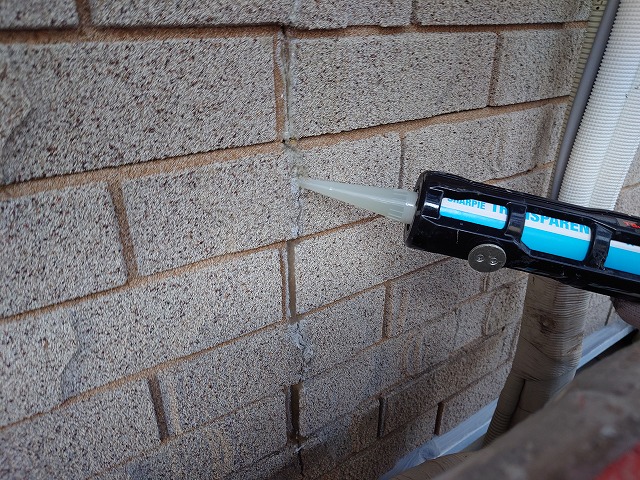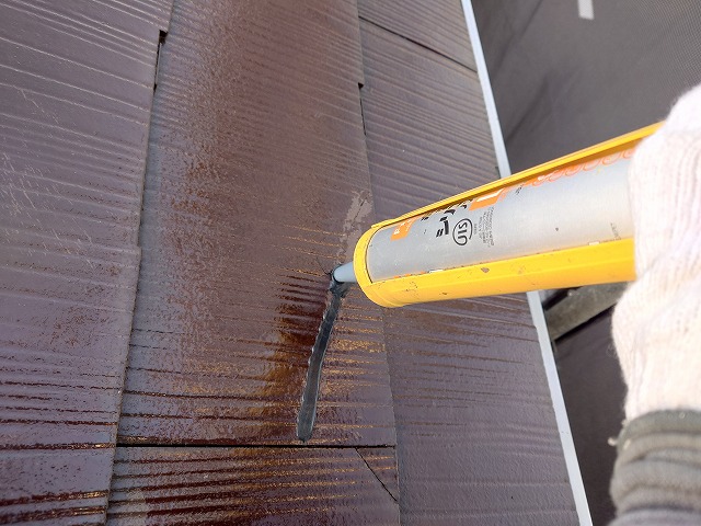 外壁サイディング目地へ新規シーリング材のヘラ均しです。