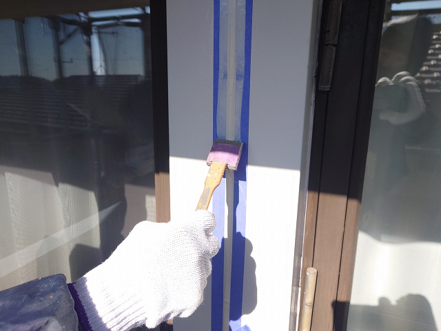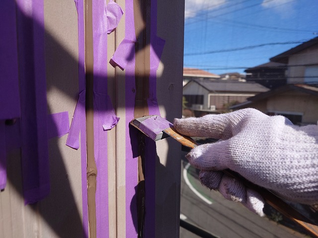写真は、外壁サイディング目地へシーリング用プライマー(下塗り材)の塗布です。