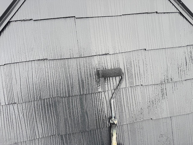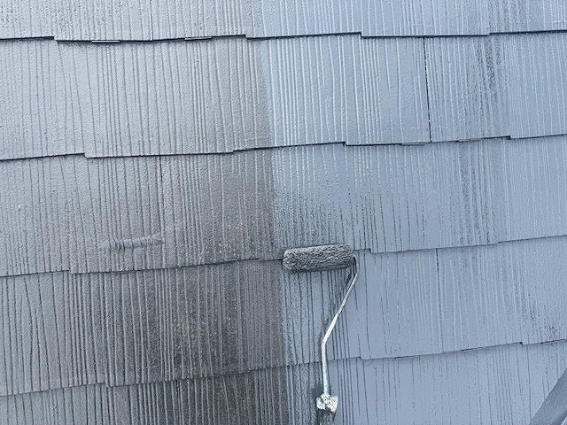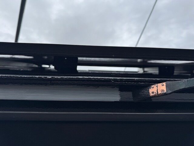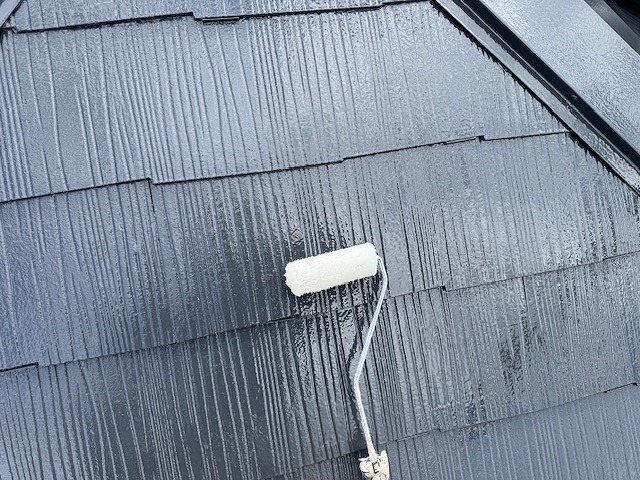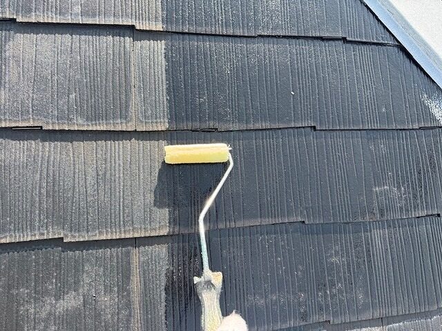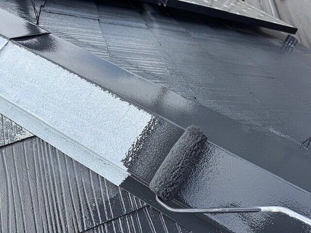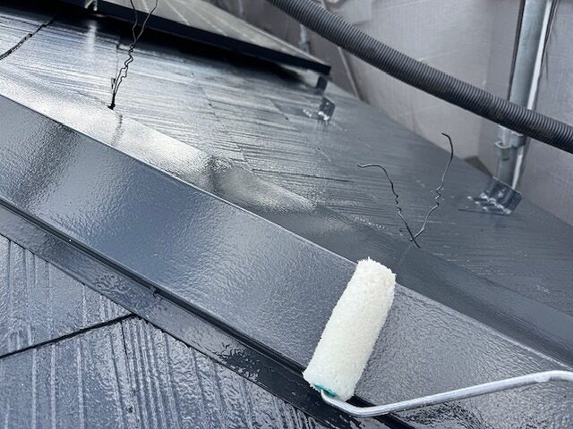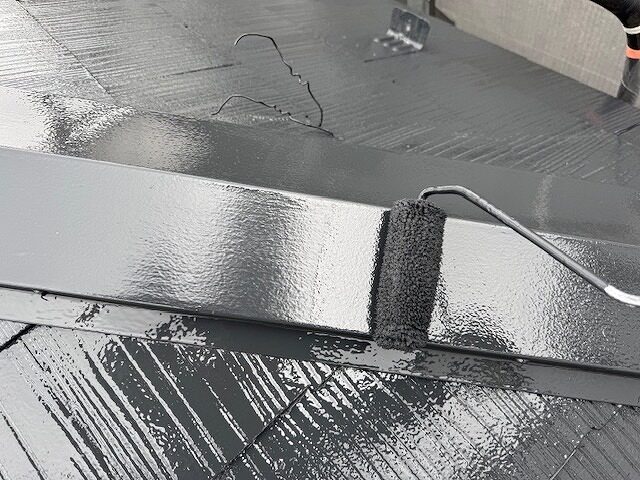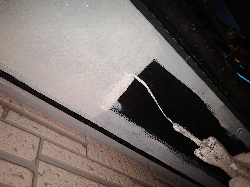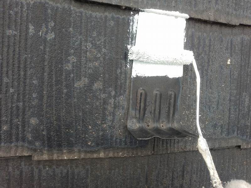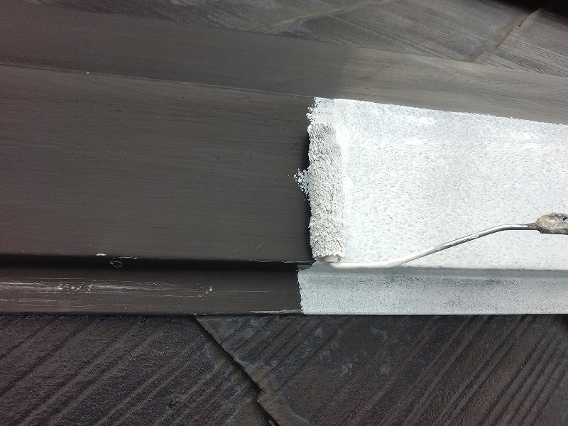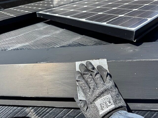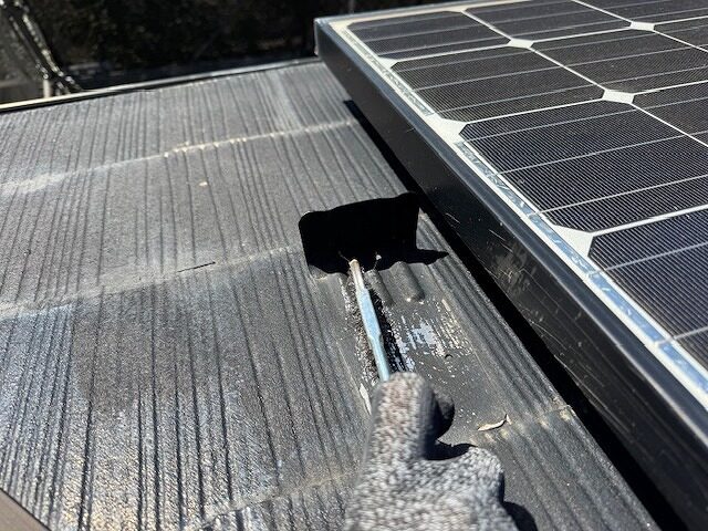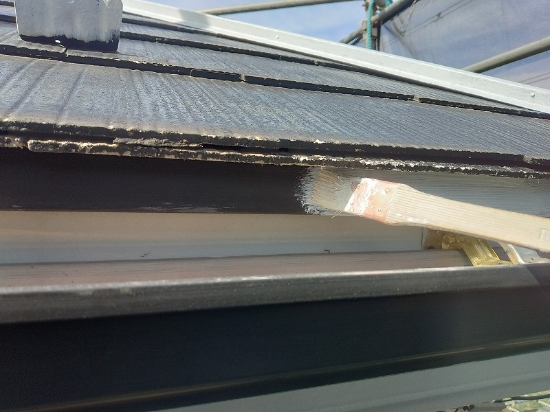 屋根板金のジョイント部分にプライマーを塗布しています。