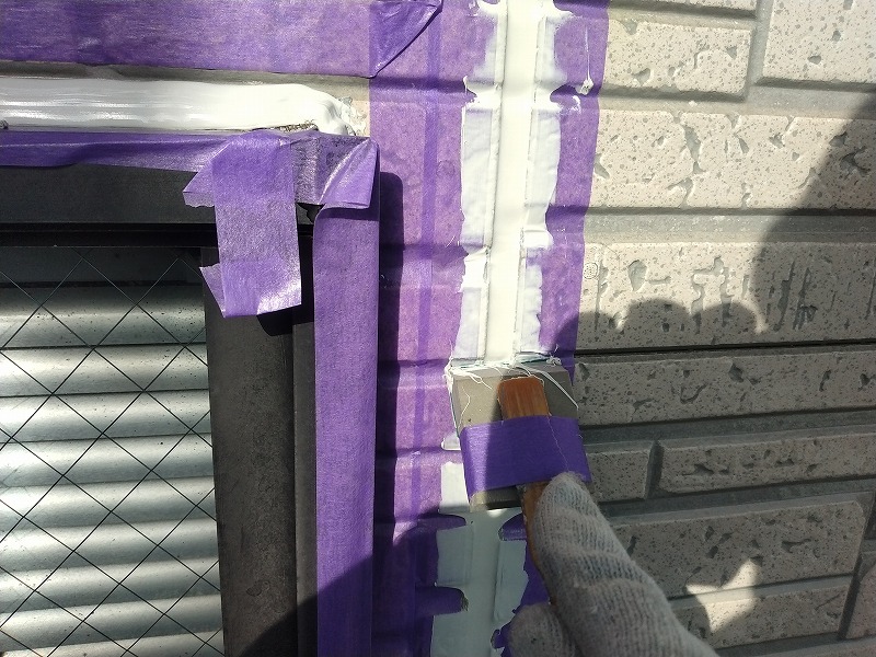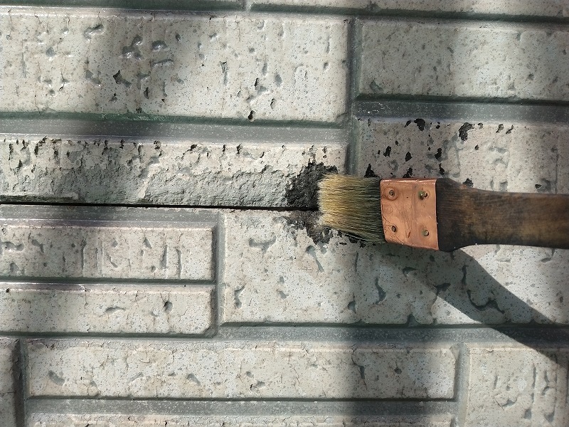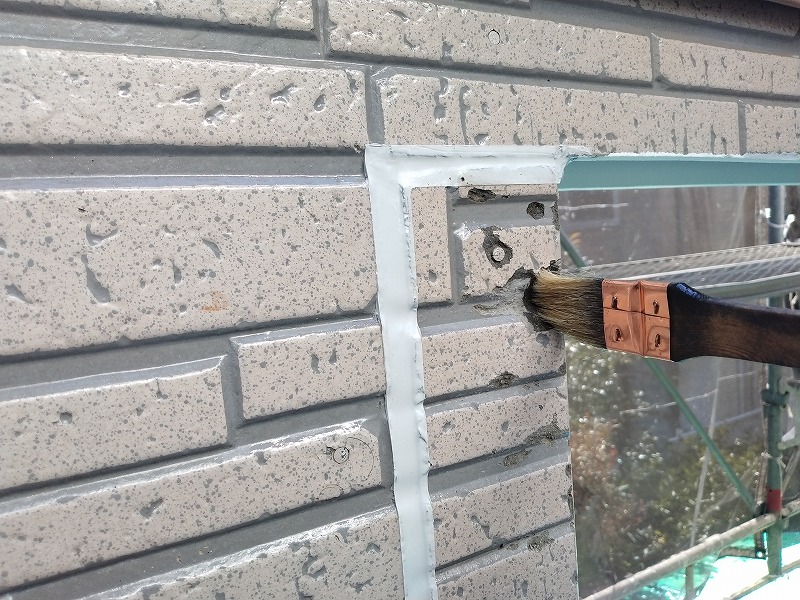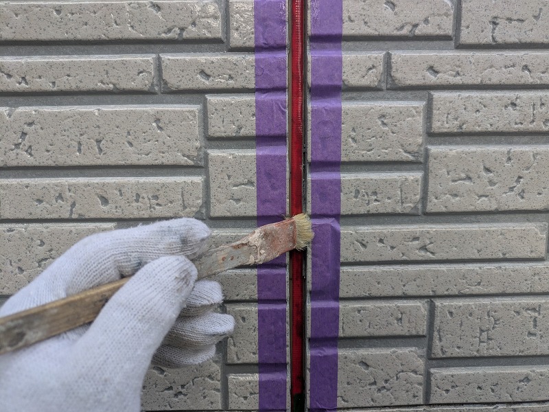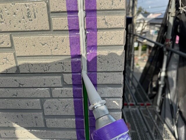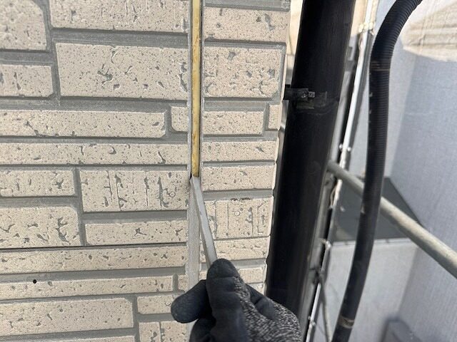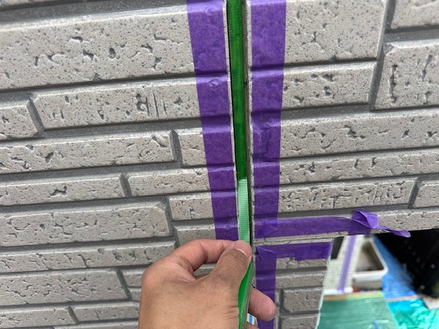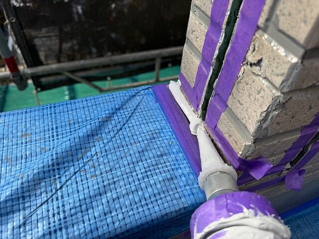 写真は外壁の目地の底部に絶縁テープを貼り付けているところです。