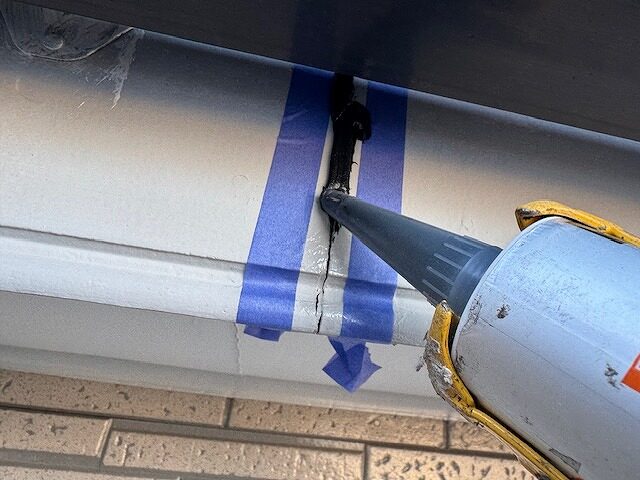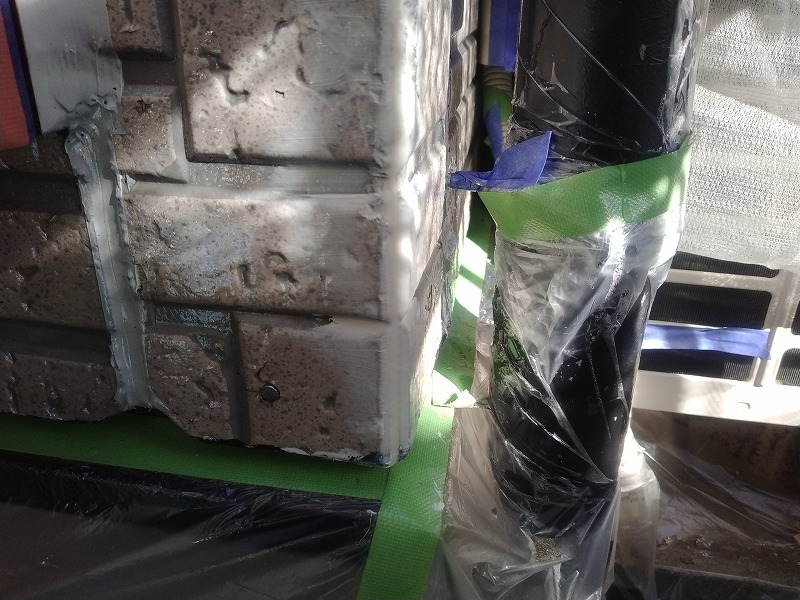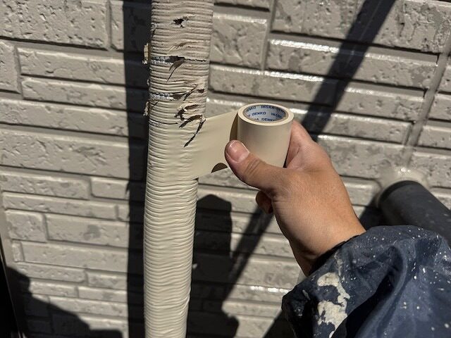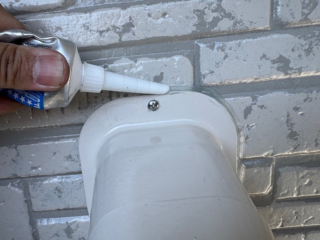 エアコン配管カバーの上部にシーリング処理をしているところです。
