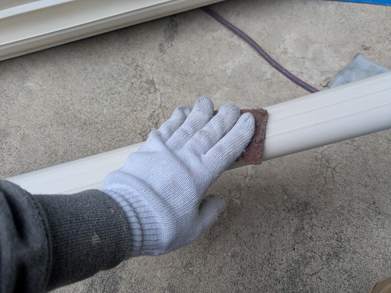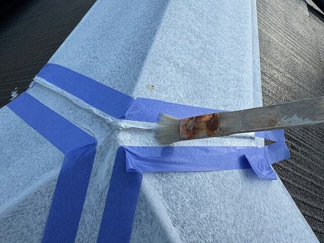 写真は鼻隠しのジョイント部分にプライマーを塗布しているところです。
