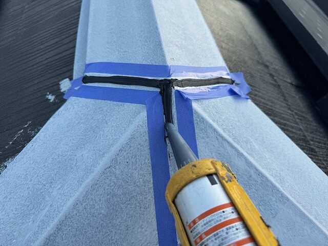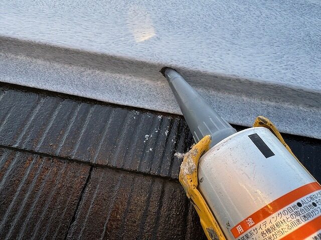 笠木と外壁の取り合いにシーリング材を充填しています。