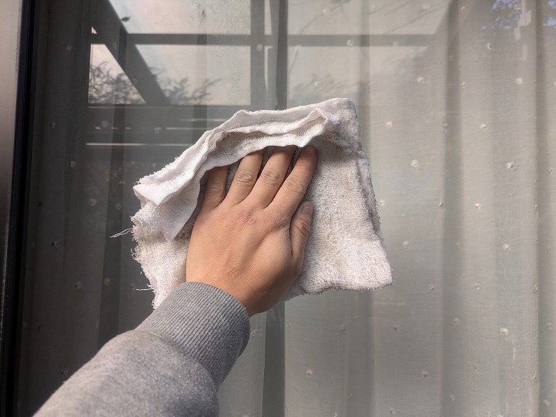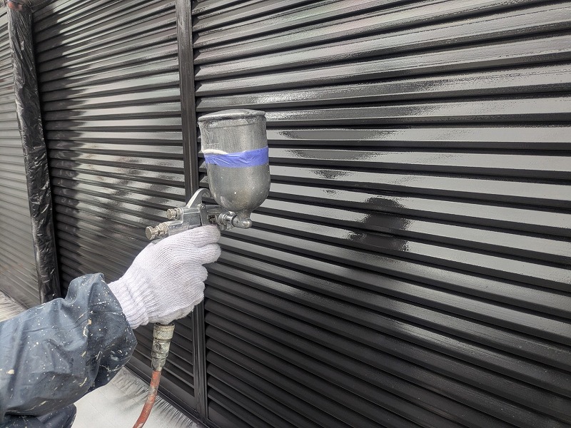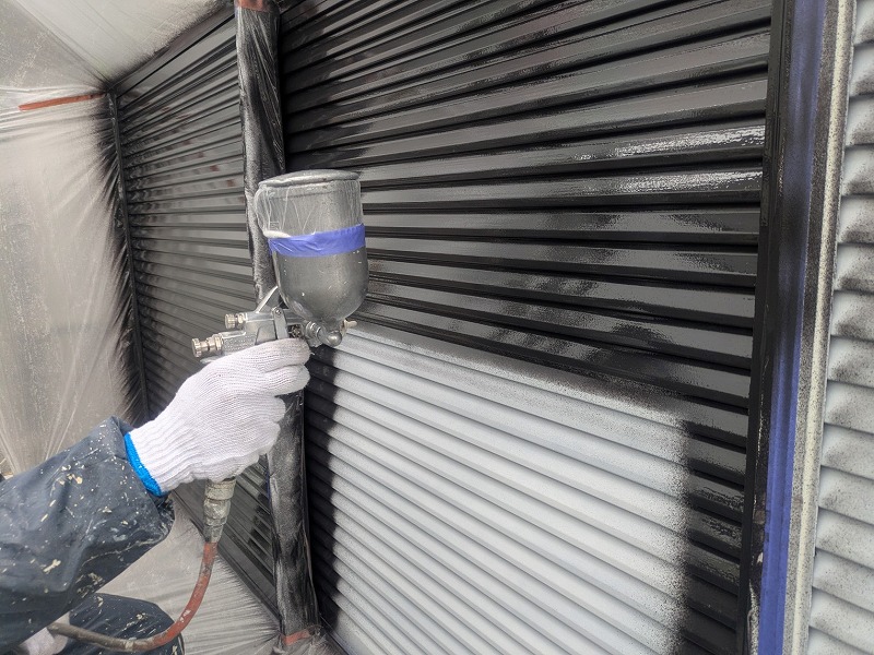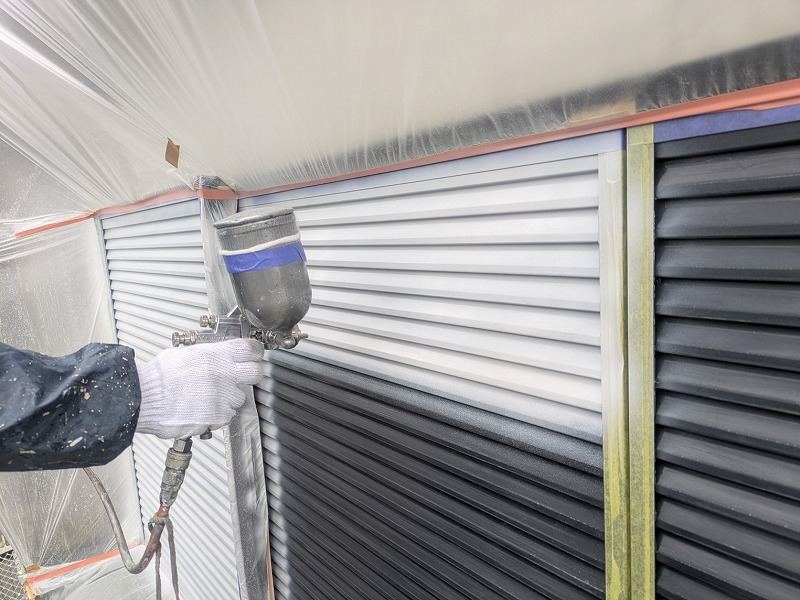 本日は雨の影響で午後からの作業で、雨戸の吹き付け塗装用の養生を行いました。